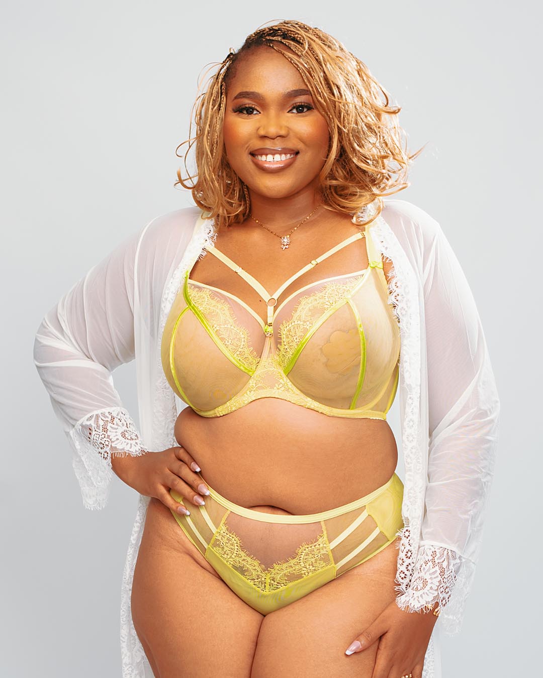 - Non-padded sheer cups adorned with sensual eyelash lace and strapping detail.
