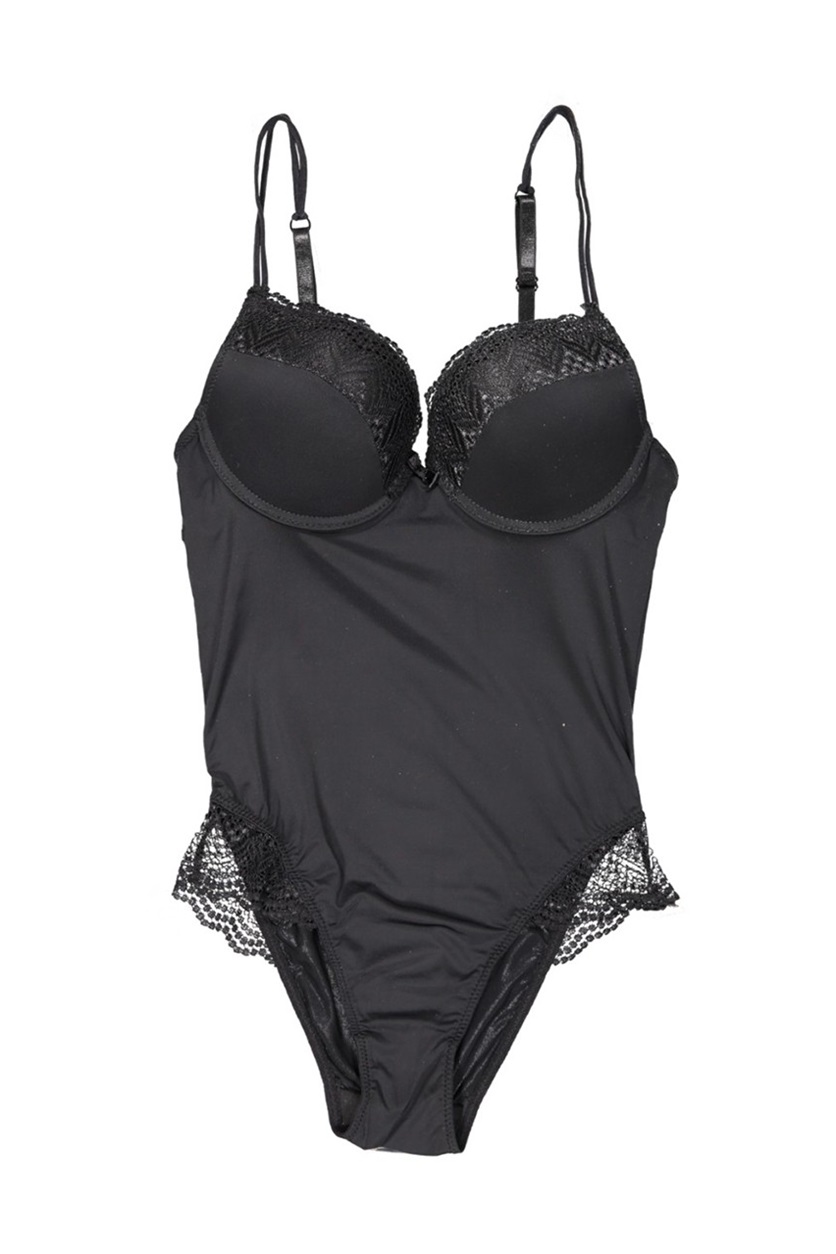 Bodysuit with padded cups, underwire, adjustable shoulder straps, hook and eye back closure.