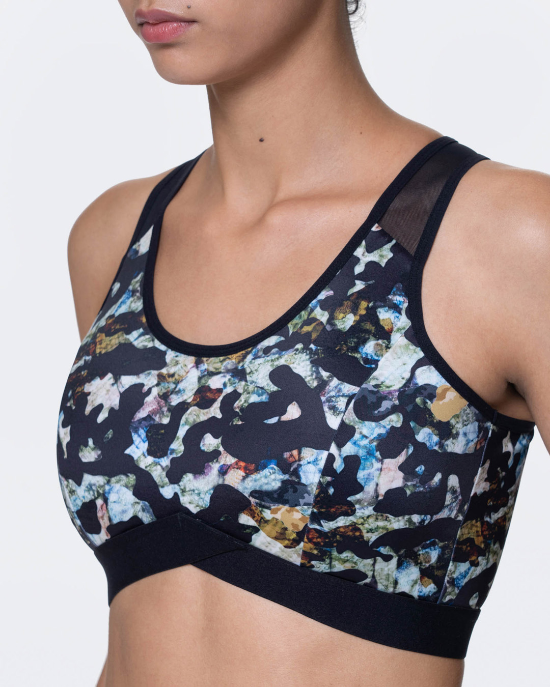 This EQUADOR sports bra is inspired by the power of the exotic jungle — as seen through its abstract camouflage print. Made from recycled micro ideal for mid-impact training, this wireless, lightly padded style features power mesh panels at back and a crossover elastic at the center front for addional support.