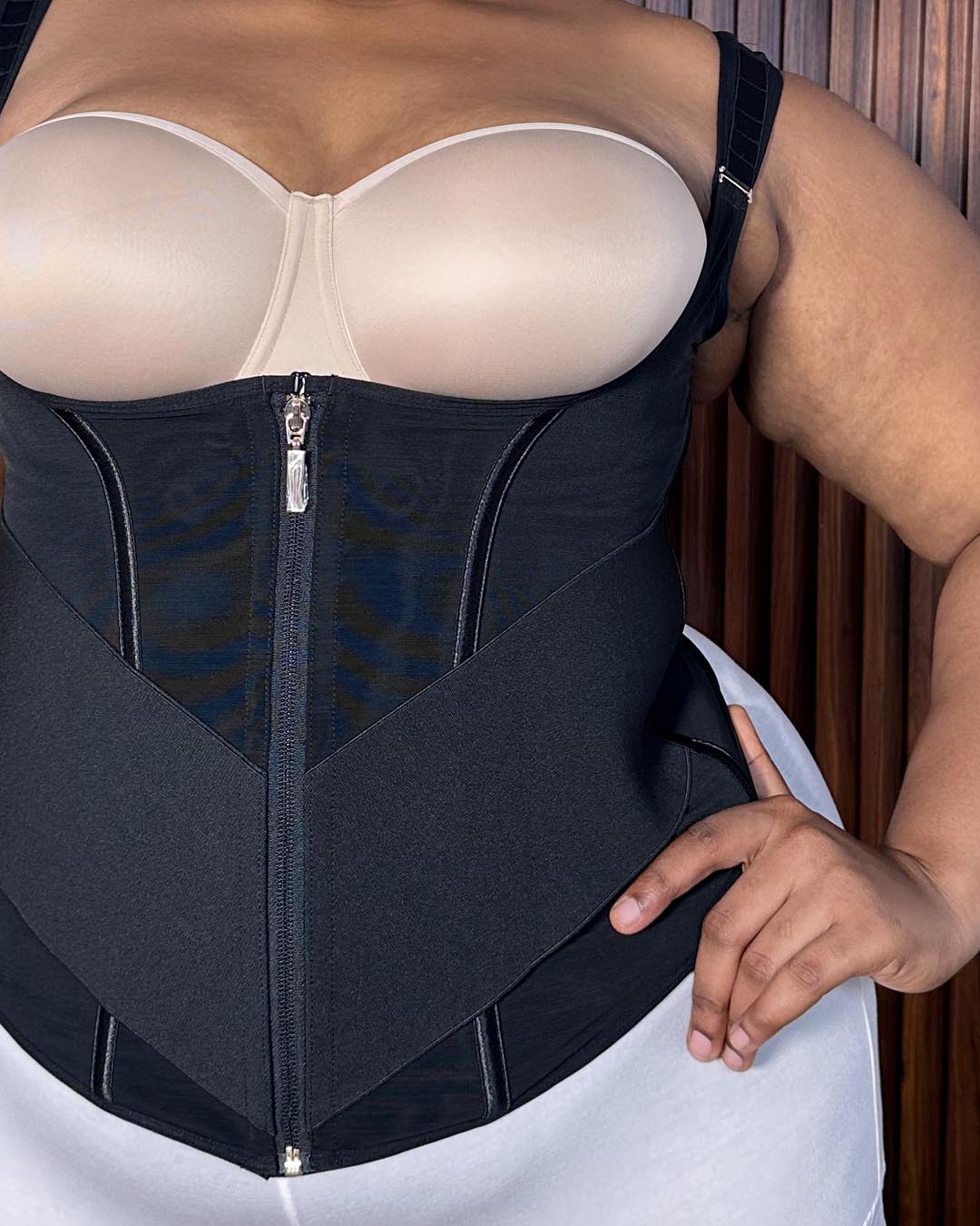 This double-layer waist cincher vest features adjustable shoulder straps to fit different heights while distributing pressure evenly, preventing shoulder strain. Seven steel bones provide firm waist support, help improve posture, and relieve back pain from prolonged sitting. The double-layer front panel combines inner hook-and-eye closure with an outer zipper for secure compression, while two wide elastic bands at the abdomen enhance tummy control. The bust-lifting vest design offers full back coverage for a straight, elegant silhouette.